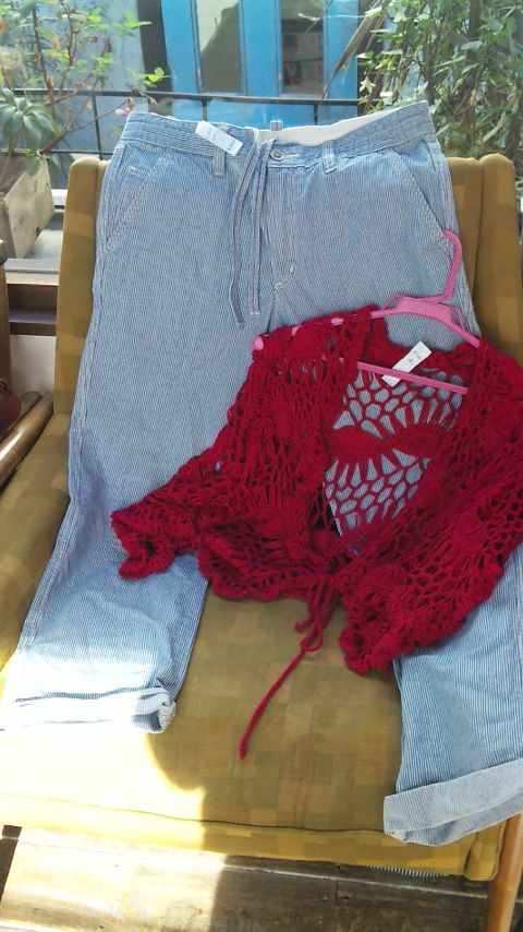 ヒッコリーパンツ 赤いかぎ編みカーデ★